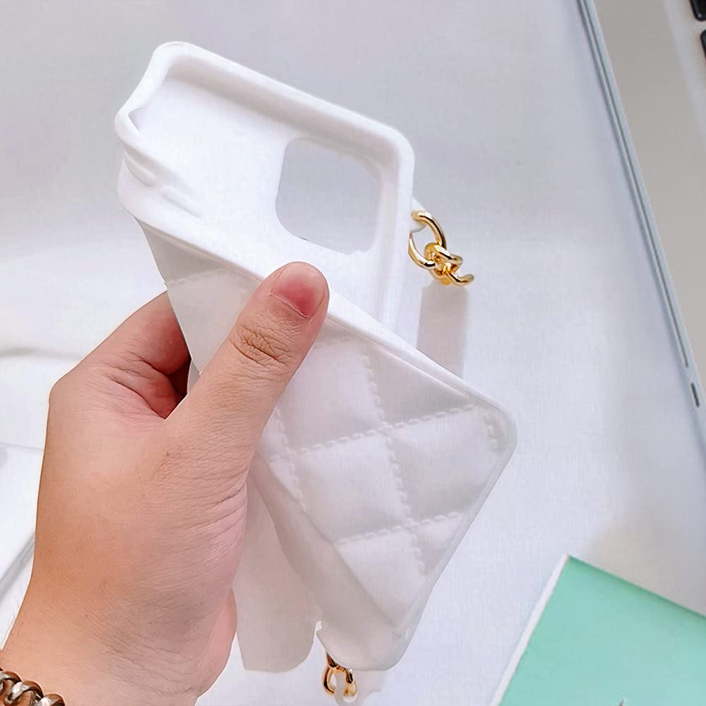 Omio Compatible with iPhone 17 Pro Wallet Case with Card Holder Luxury Chain Case with Long Pearl Shoulder Crossbody Lanyard Wrist Strap Soft Silicone Handbag Cover for Women Girls White