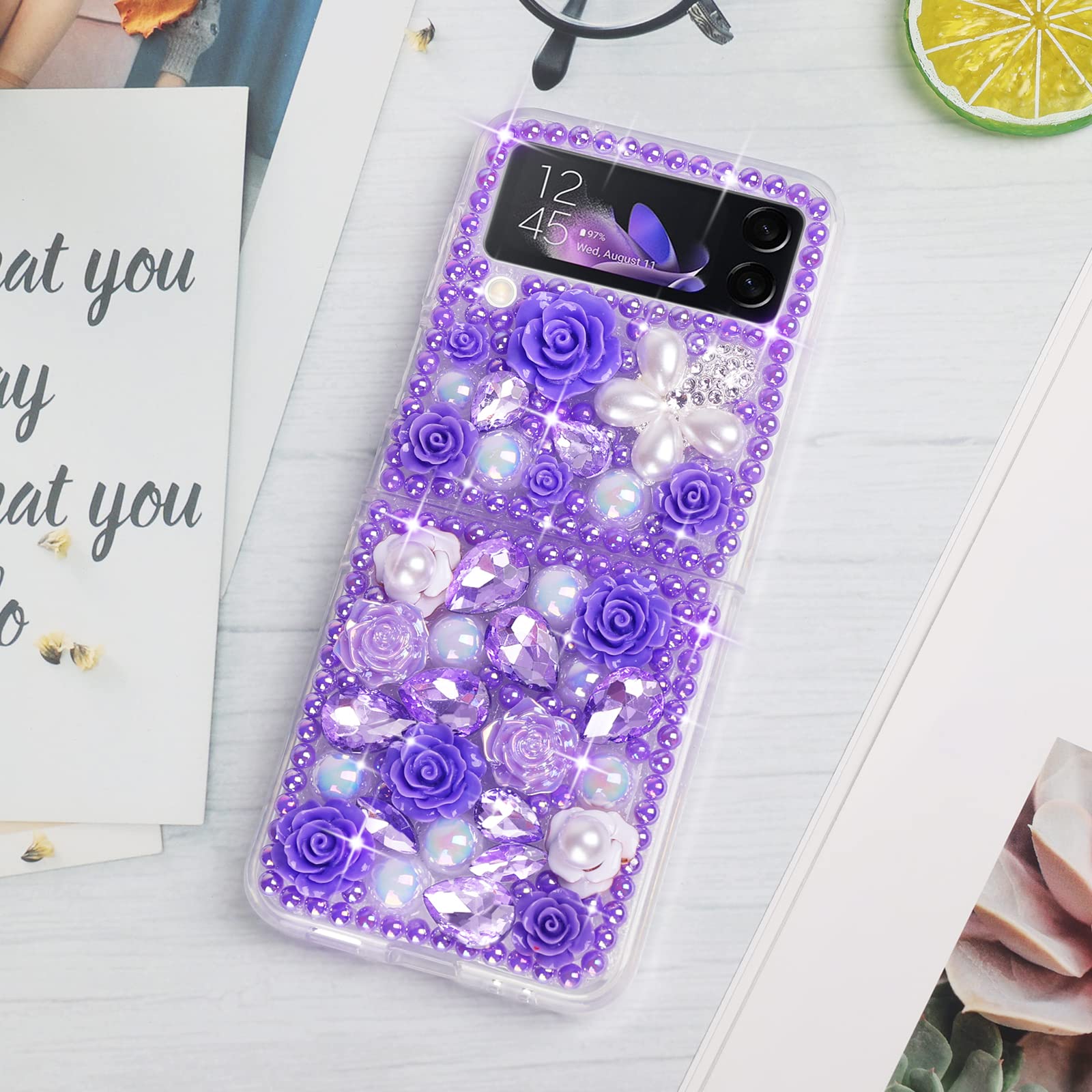 Omio Designed for Samsung Galaxy Z Flip 4 Case Luxury Sparkle Stunning Stones Crystal Rose Flowers Bling Diamond Glitter Rhinestone Shockproof Hard PC Phone Case for Galaxy Z Flip 4 Women Girls Purple