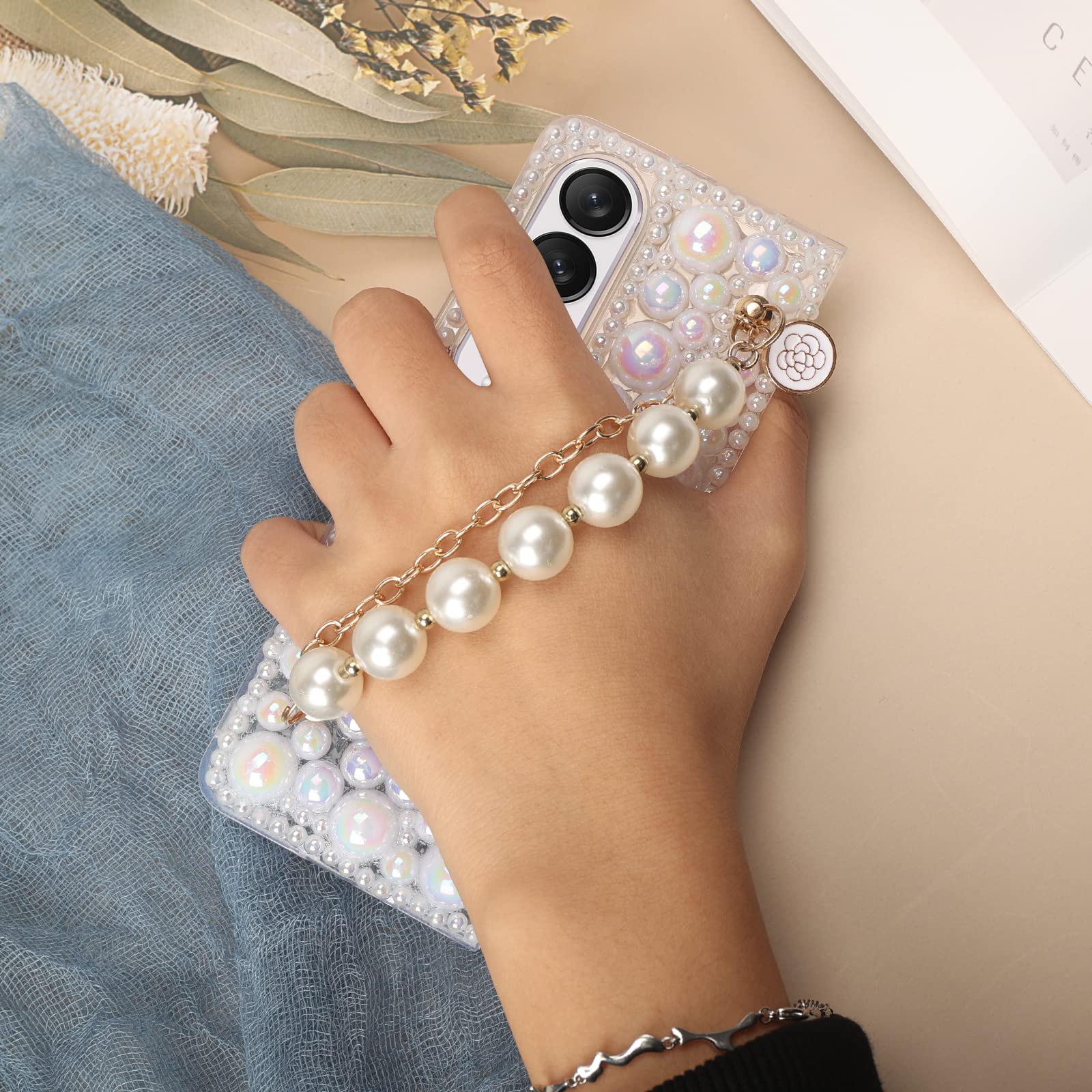 Omio Designed for Samsung Galaxy Z Fold 4 Case Cute for Women Girls Luxury Sparkle Rhinestone Skull Pearl Crystal Strap Chain Bracelet Bling Glitter Diamond Slim Acrylic Shockproof Cover, Pearl—