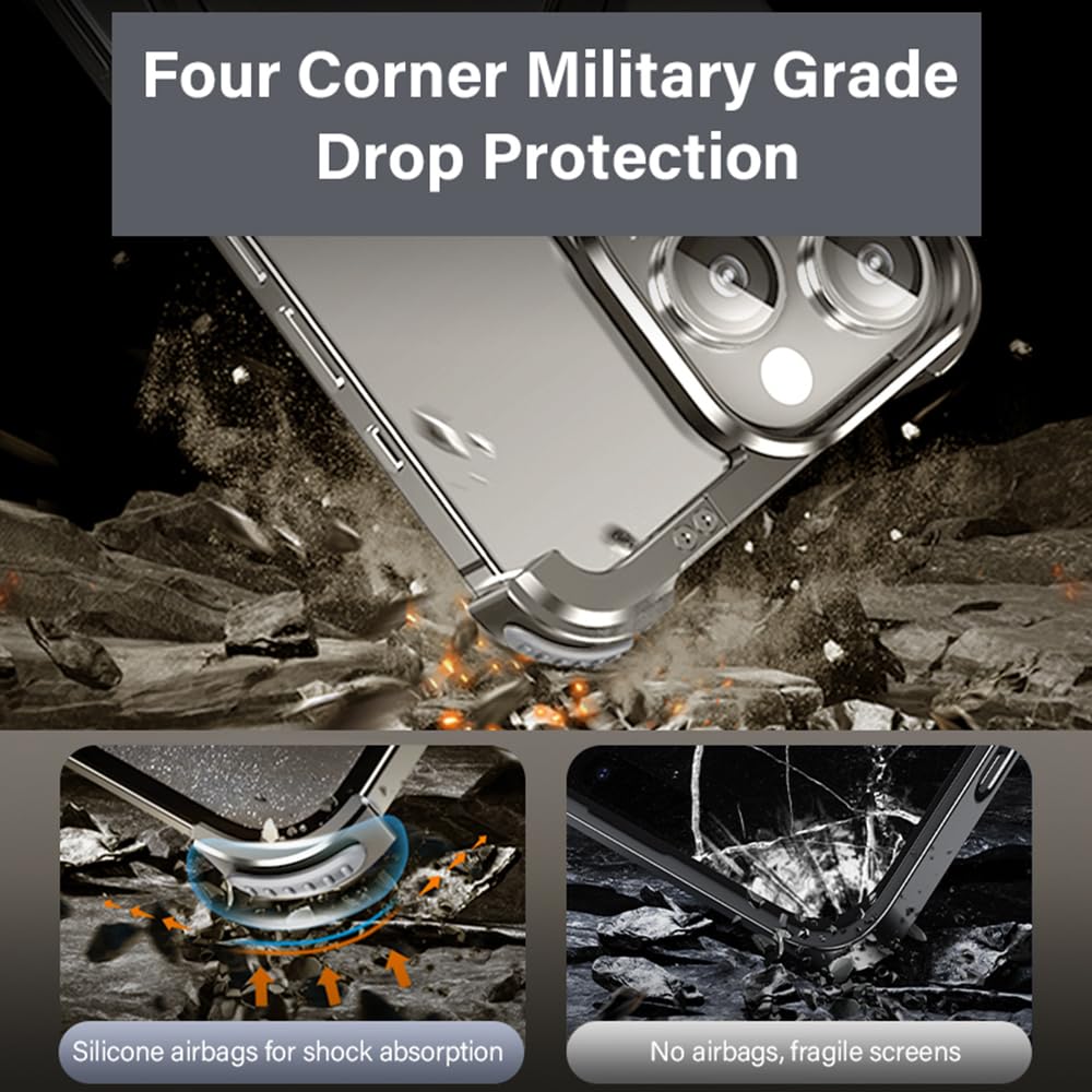 - [Military Grade Drop Shockproof Protection] This iPhone 15 Pro Max case bumper is made of high quality aluminum alloy material. Combined with four-corner silicone pad, effectively reduce the impact of falling on the phone. Provide ultimate protection for your iPhone 15 Pro Max. This frameless stand case won't hide phone's original beauty and color.