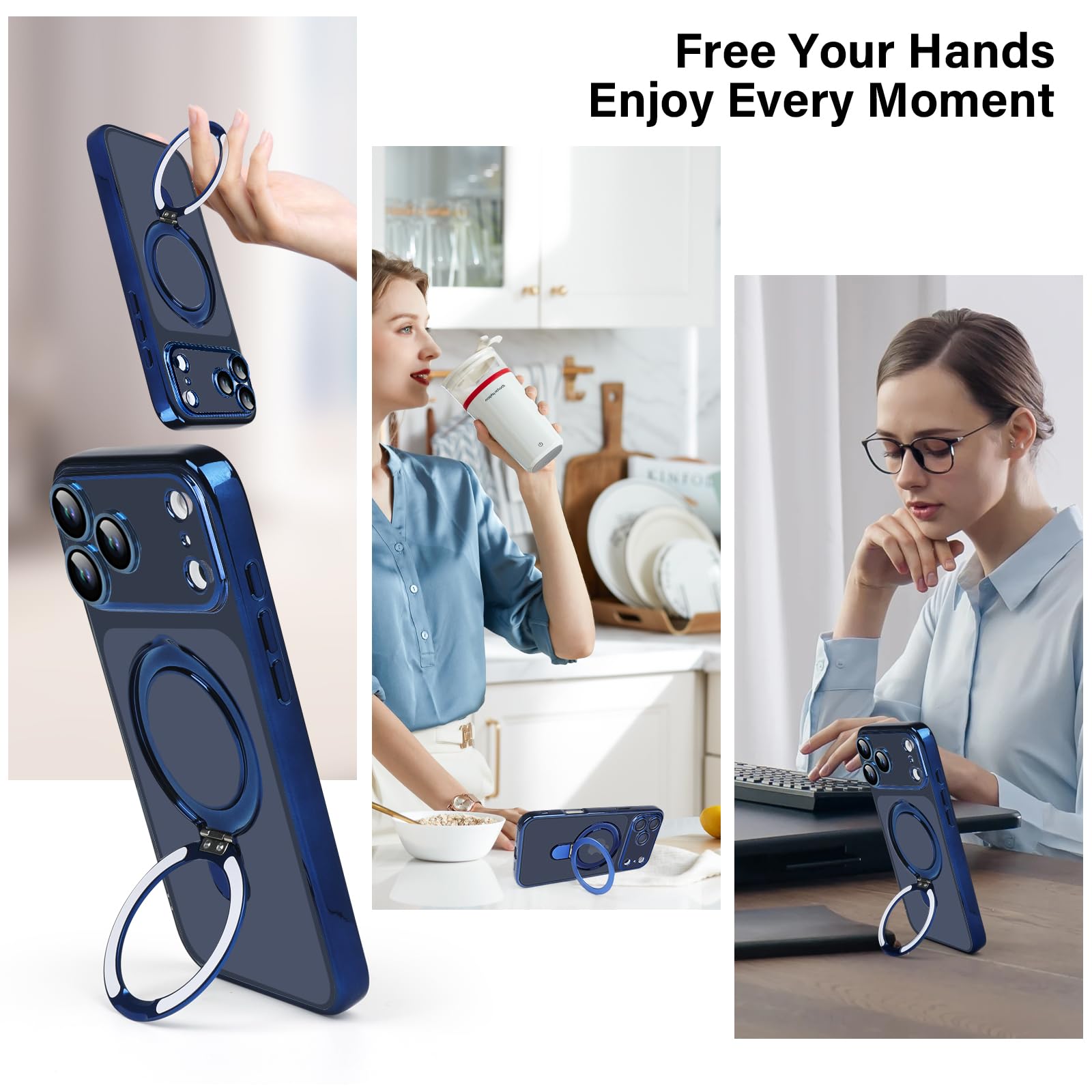 Omio Magnetic Invisible Stand for iPhone 17 Pro Case Compatible with MagSafe, Military Drop Protection Clear Plating Slim Soft Shockproof Case with Camera Lens Protector for Men Women Deep Blue—