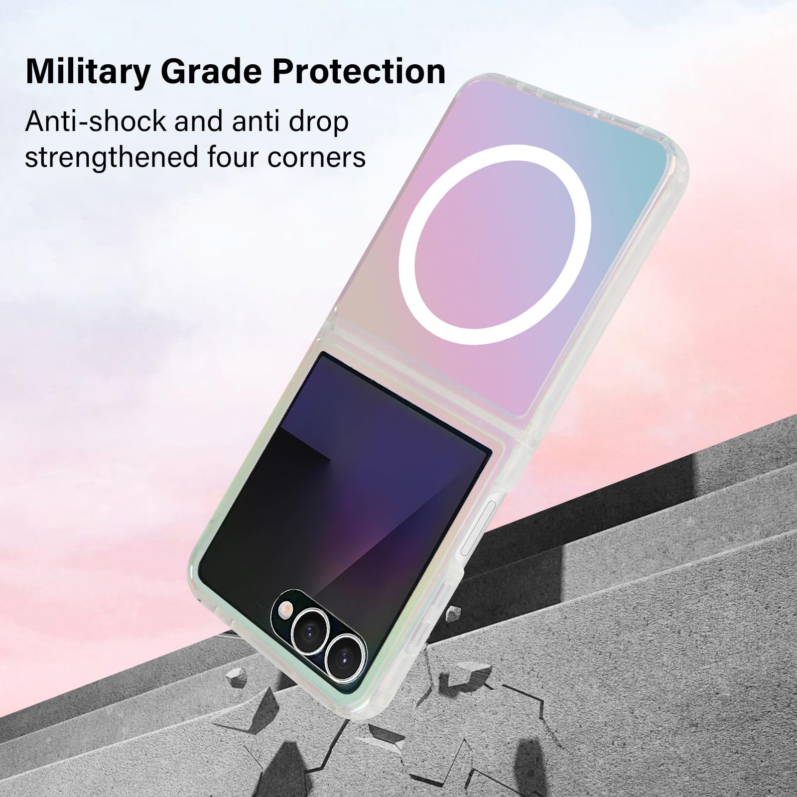 Omio Magnetic Iridescent Clear Case for Galaxy Z Flip 7 Compatible with MagSafe, [Built-in Small Screen Protector] Fluorescent Clear Crystal Laser Shockproof Cover for Women Girls, Clear Laser